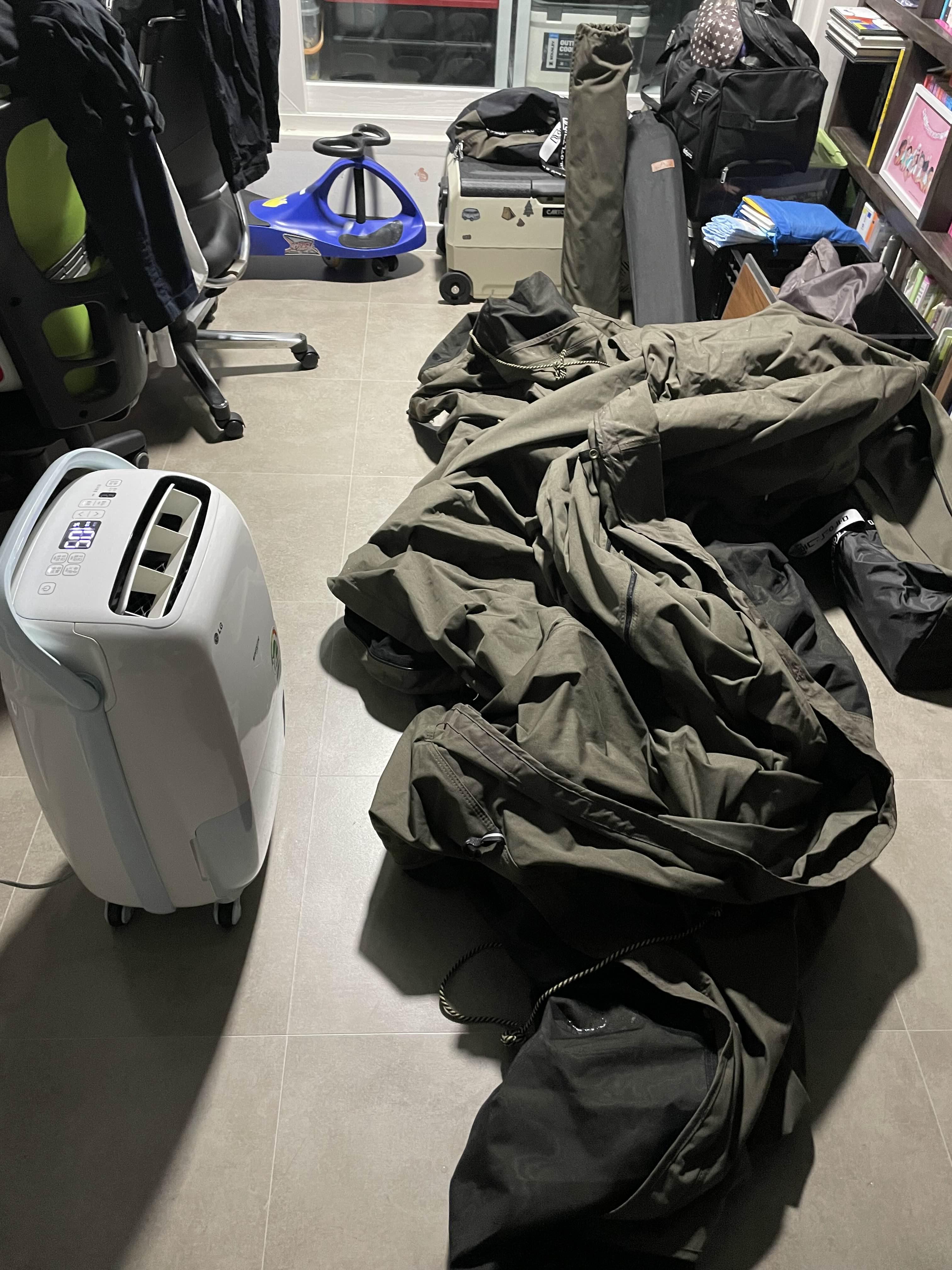 철수 후 면텐트는 곰팡이가 생기지 않도록 방부재를 뿌려주고 철수합니다